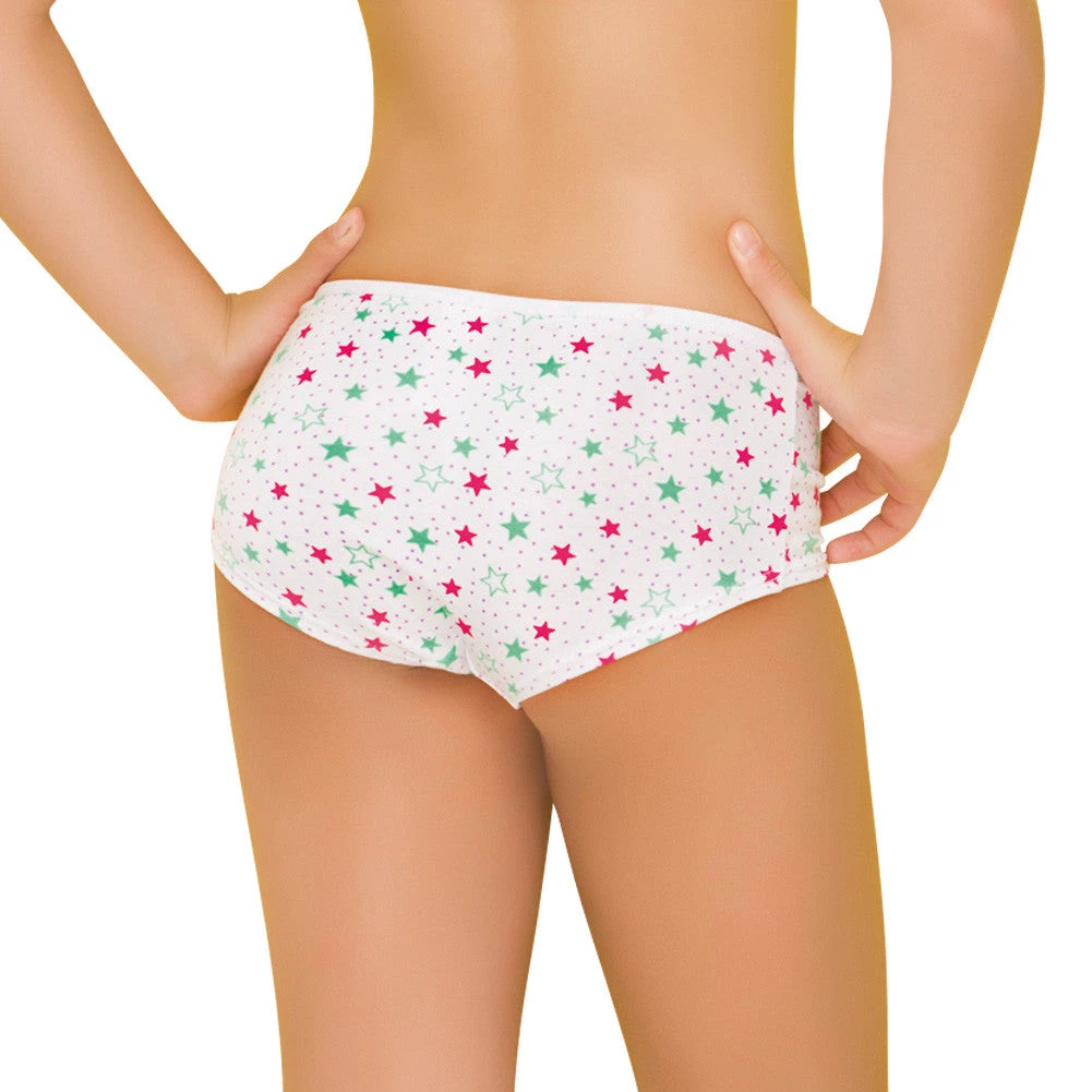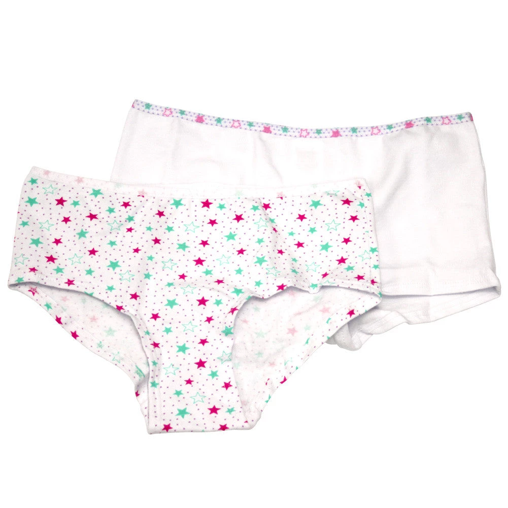 Two white girls underwear. The brief has printed stars in vibrant pink and green whilst the short has a plain white leg with a star printed waist band. Material composition: 94% Cotton, 6% Spandex.