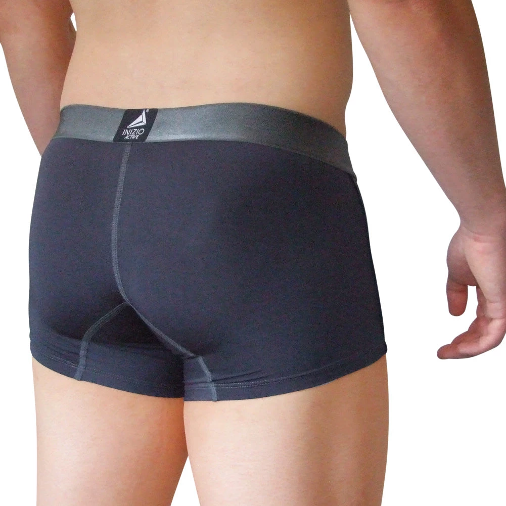 A microfibre boxer short in grey with a vertical piping detail running down the outside of each thigh. Grey elastic waistband stitched with the Inizio brand name in grey. Material Composition: 75% Polyamide, 25% Spandex.
