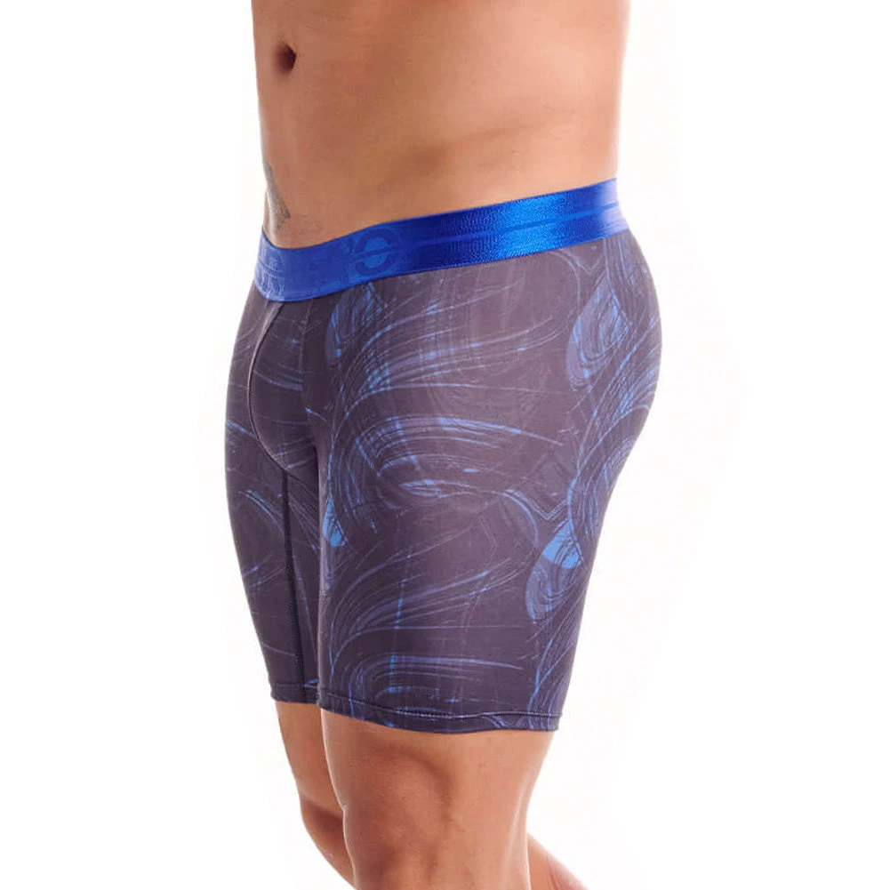Deep blue long leg boxer with light blue swirling lines graphic pattern, and an electric blue elastic waist band stitched with the Tarrao brand name. Fantastic long leg men’s boxer graphic print design. Material Composition: 79% Polyester, 21% Elastane.