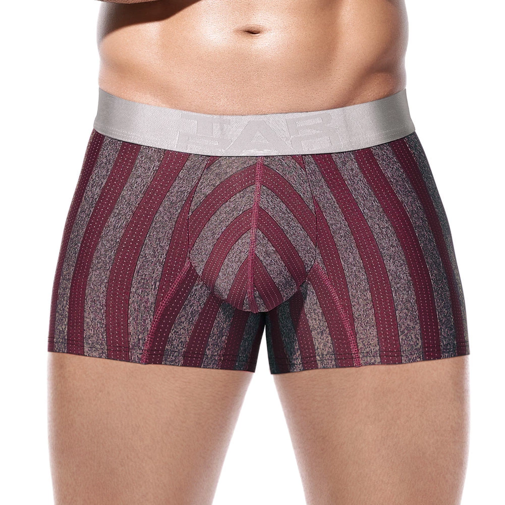 Microfibre boxer short in a wide band red and speckled grey vertical stripe with a grey elastic waist band stitched with the Tarrao brand name in grey. Material Composition: 93% Polyamide, 7% Spandex.