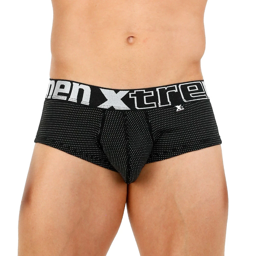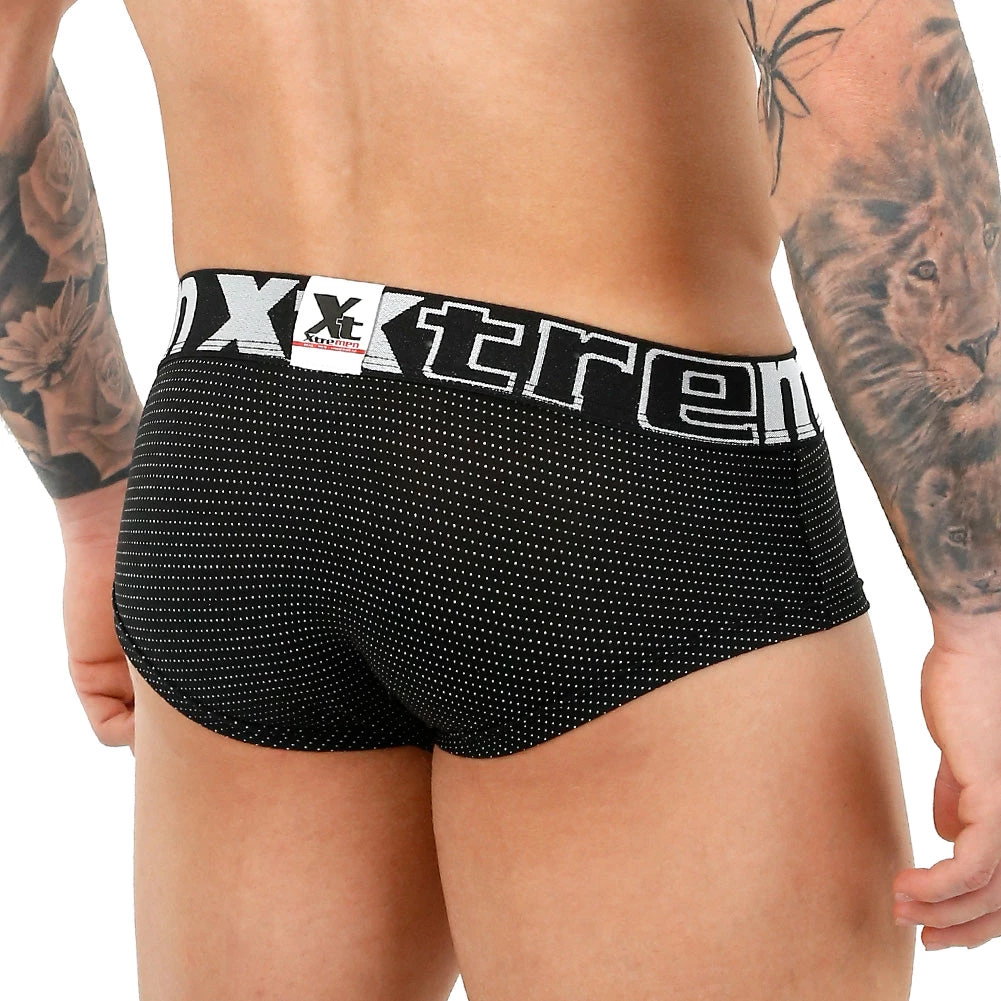 Black brief with a tiny white dot weave patterning, with a black elastic waist band stitched with the Xtremen brand name in grey. Material Composition: 65% Polyester, 25% Cotton, 10% Elastane.
