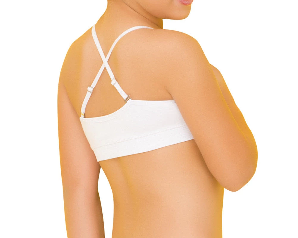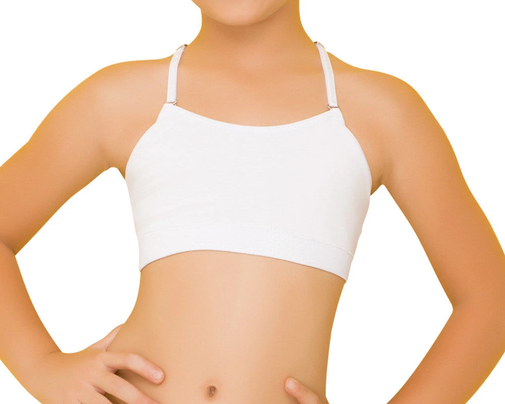 A 2-pack of plain white girl’s vest top underwear, one with regular shoulder straps the other with an athletic style back. Suitable for everyday use. Material composition: 94% Cotton, 6% Spandex.