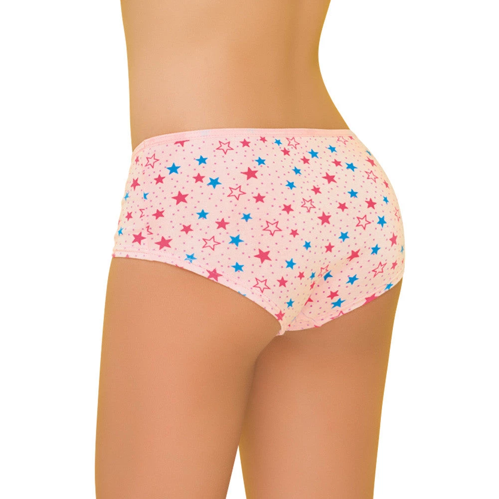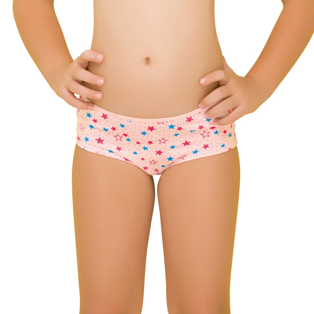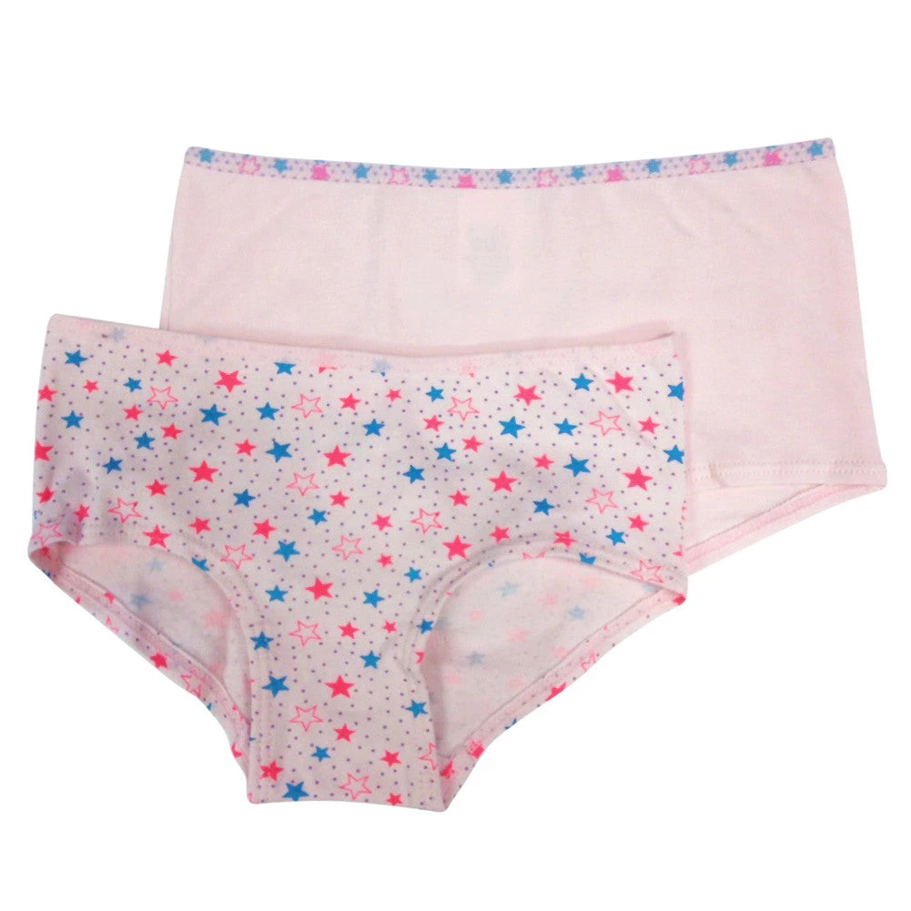 Two pale pink girls underwear. The brief has printed stars in vibrant pink and blue whilst the short has a plain pale pink leg with a star printed waist band. Material composition: 94% Cotton, 6% Spandex.