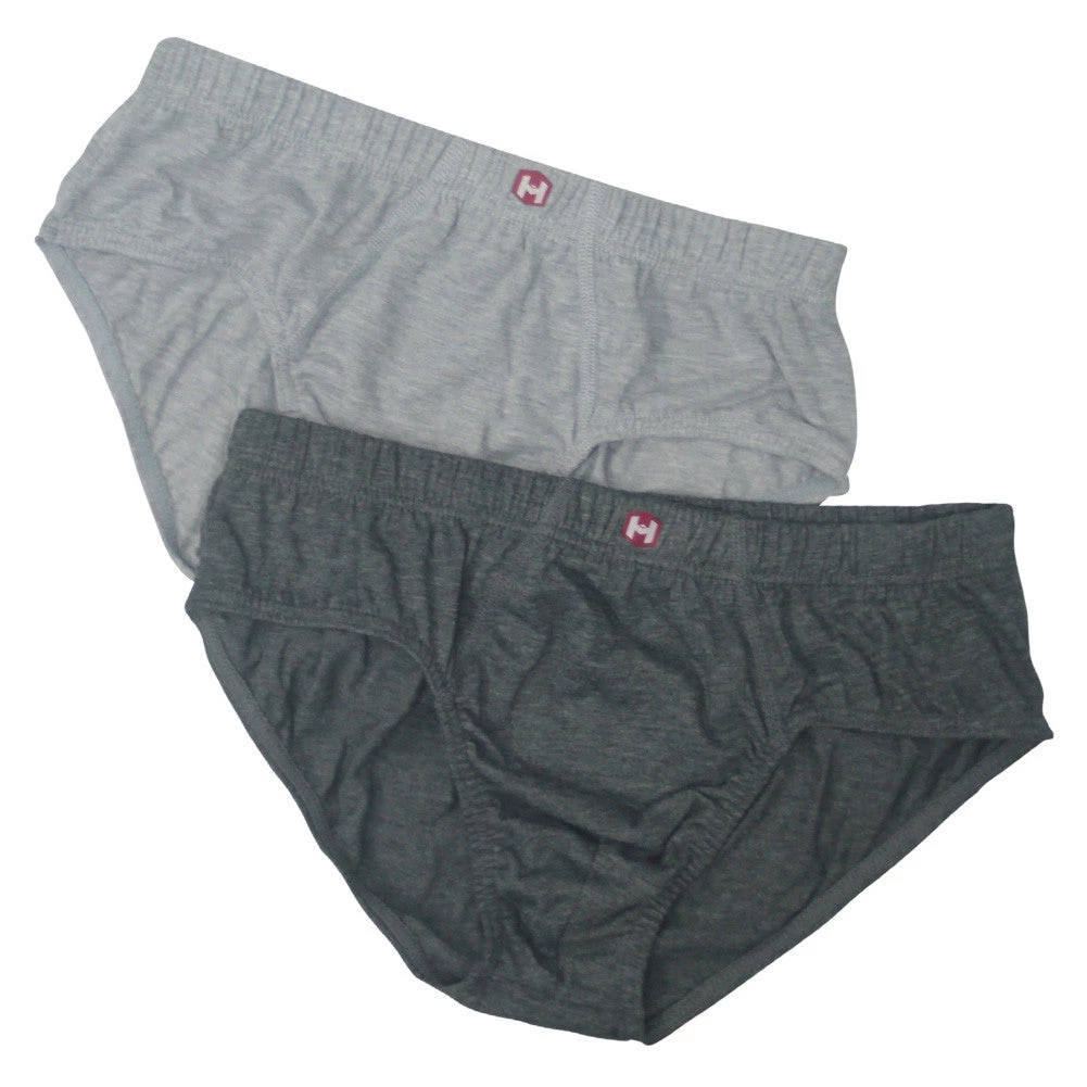 A 2-pack of mens briefs. Made from a slightly mottled fabric with an elastic waist band. Features the Hispano ‘H’ logo stitched on the waist band. Material composition: 65% Polyester, 35% Cotton. Pack contains: 1x light grey brief, 1x dark grey brief.