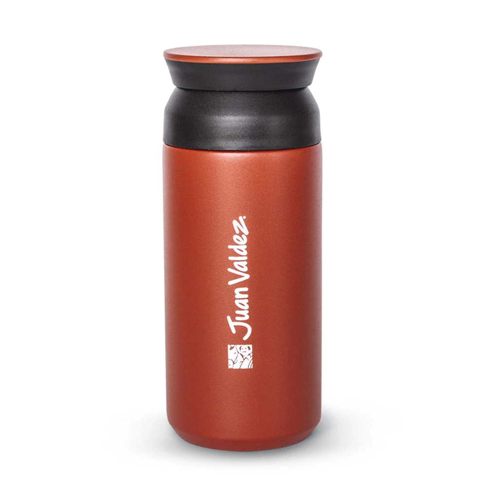 The Juan Valdez® Red Thermo Tumbler vacuum flask, a rust red satin finish flask body printed with the Juan Valdez® logo and brand name in white. 350ml volume capacity.