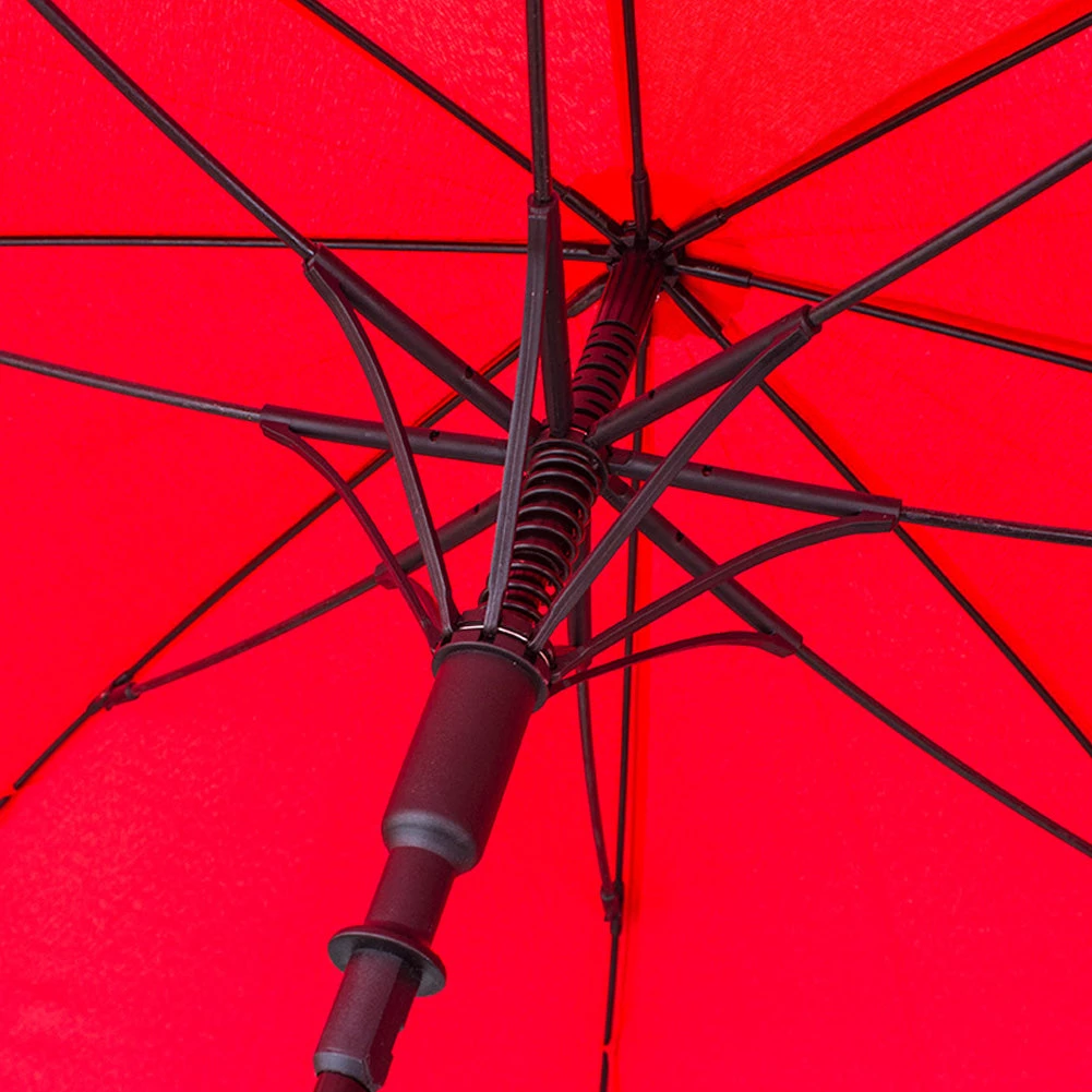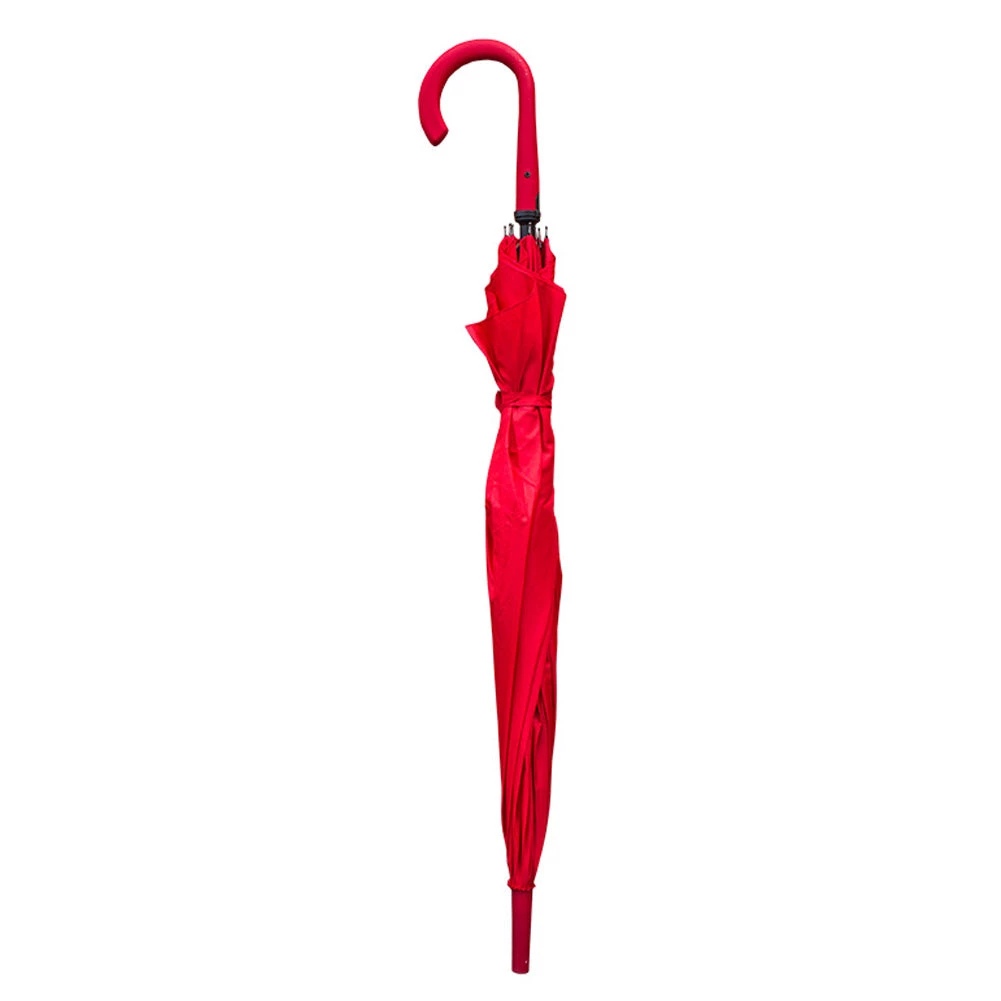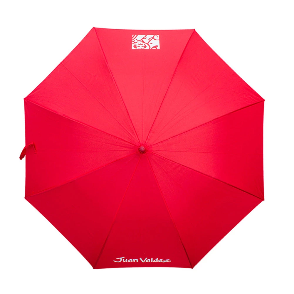 Fantastic Juan Valdez® umbrella in bright red featuring the Juan Valdez® logo and brand name on opposite sides of the canopy in white. Red handle and ferrule, and black ribs, shaft and runner framework.