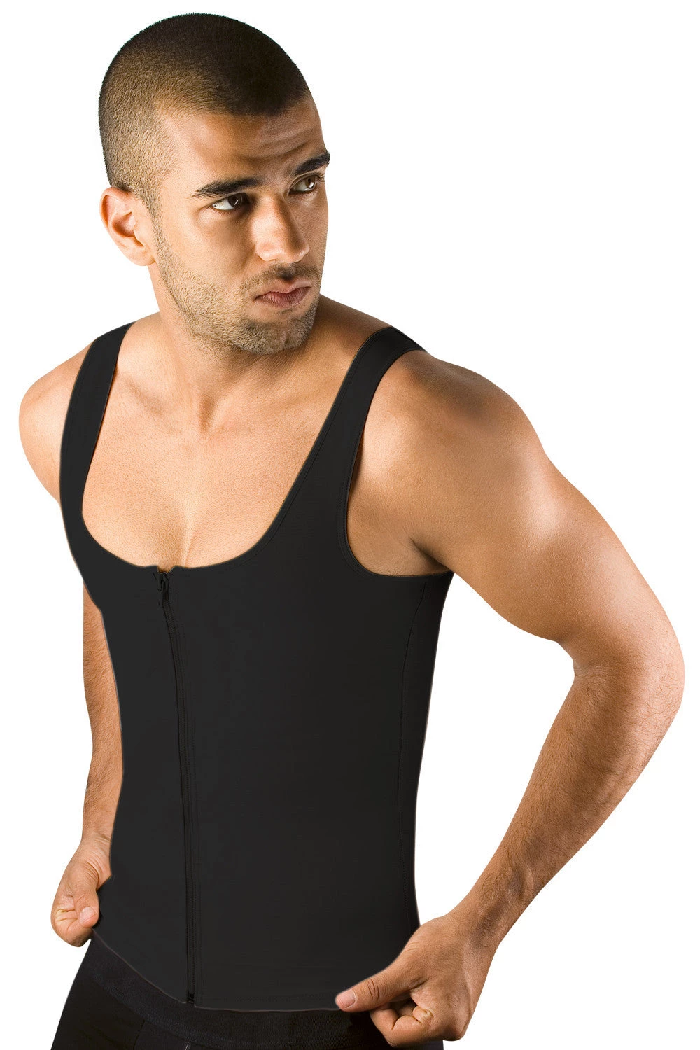 Moldeate Men’s Shapewear Compression Vest: Black coloured shapewear compression vest designed to strengthen the abdominal muscles and can help to reduce back pain. Designed and produced using the latest textile based Lycra® technology, compression vests provide comfort, style and support allowing shape control and body definition. This compression vest has a front fastening zip with additional inner ‘hook & eye’ fasteners.