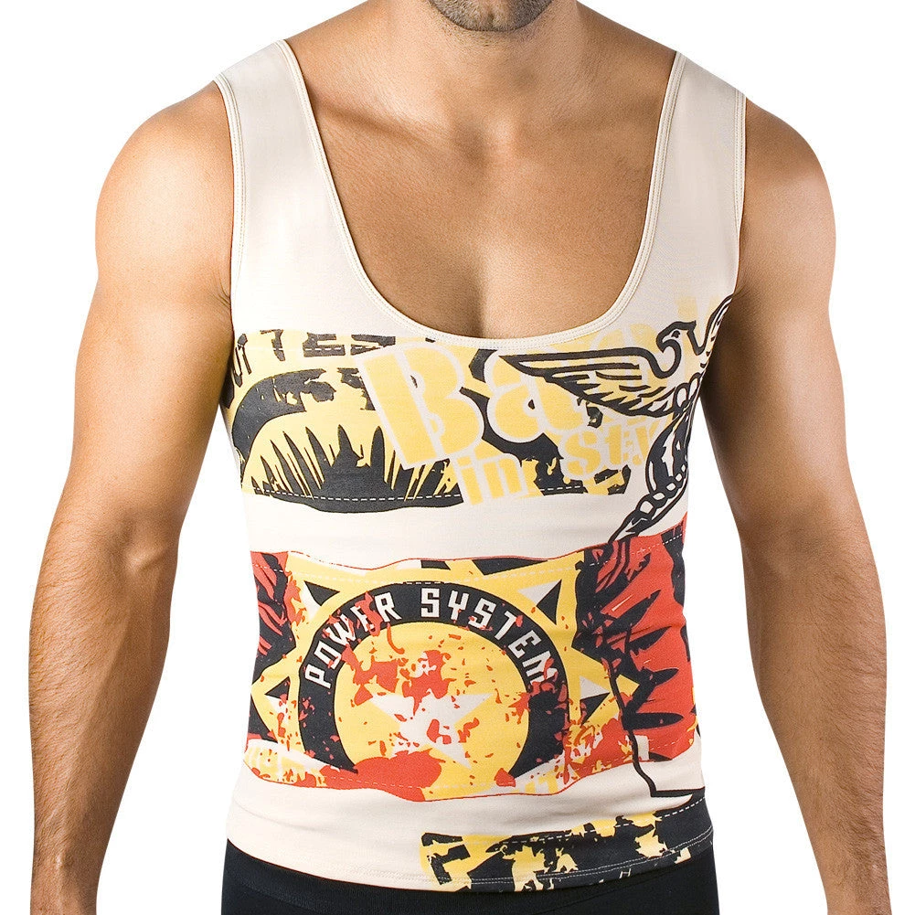 Moldeate Men’s Shapewear Compression Vest: Natural coloured shapewear compression vest designed to strengthen the abdominal muscles and can help to reduce back pain. Designed and produced using the latest textile based Lycra® technology, compression vests provide comfort, style and support allowing shape control and body definition. This design features a colourful graphic print on the front in black, yellow and red.