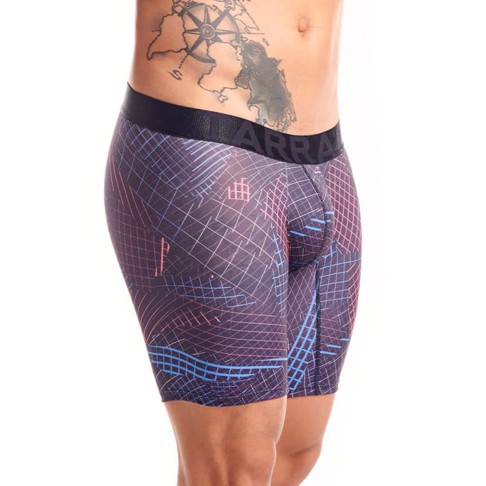 Blue long leg boxer with red, blue and grey square grid graphic pattern, and a black elastic waist band stitched with the Tarrao brand name. Fantastic long leg men’s boxer graphic print design. Material Composition: 79% Polyester, 21% Elastane.