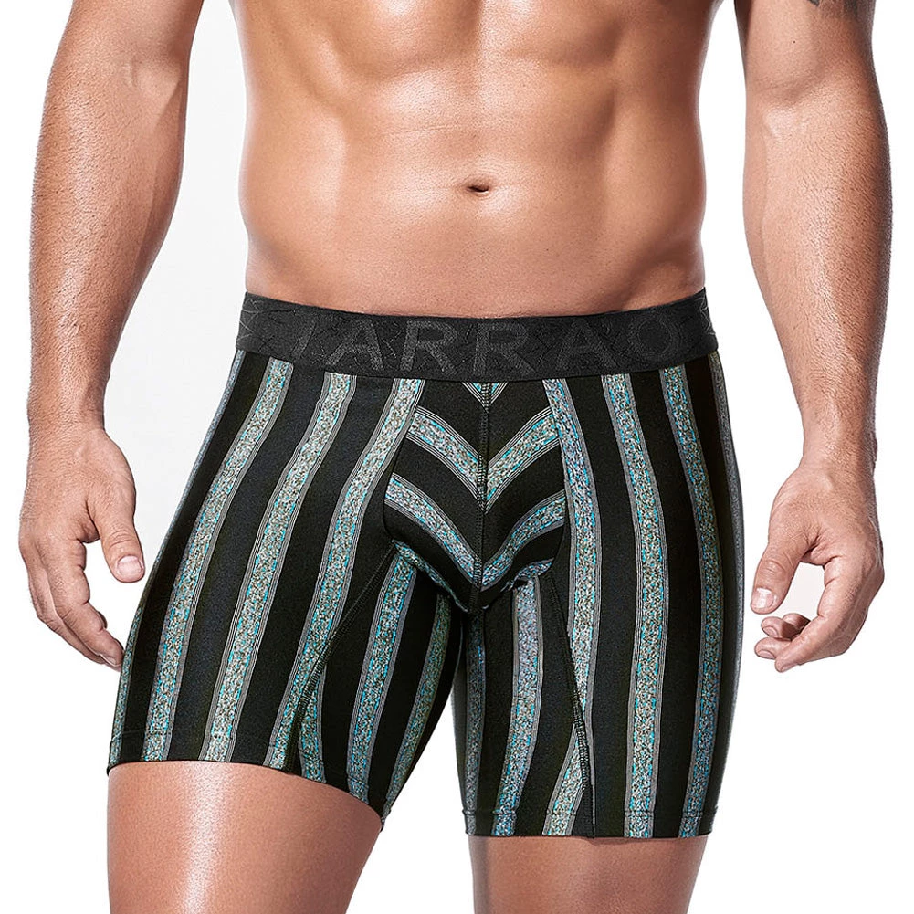 Microfibre long leg boxer in a wide band black and speckled grey vertical stripe with a black elastic waist band stitched with the Tarrao brand name in black. Material Composition: 93% Polyamide, 7% Spandex.