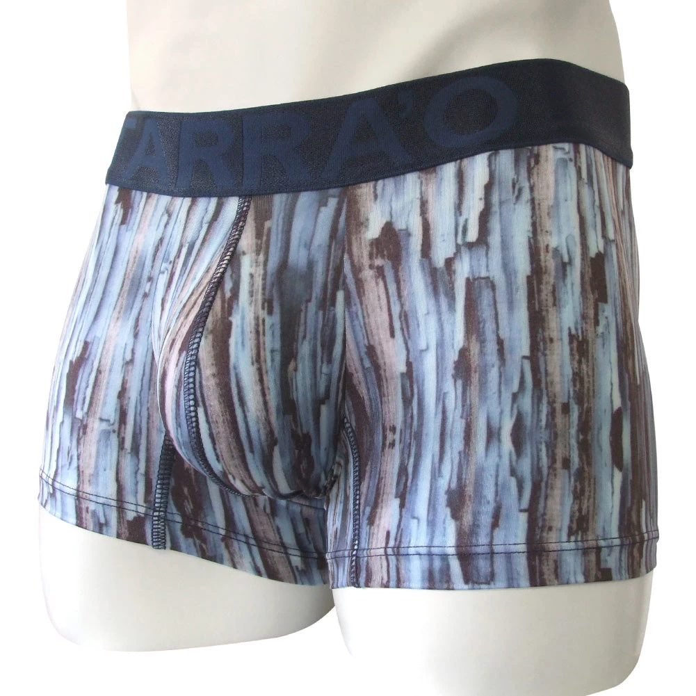 Microfibre boxer short with a vertical artist brush stroke graphic print design and a dark blue elastic waist band stitched with the Tarrao brand name in blue. Material Composition: 79% Polyester, 21% Spandex.