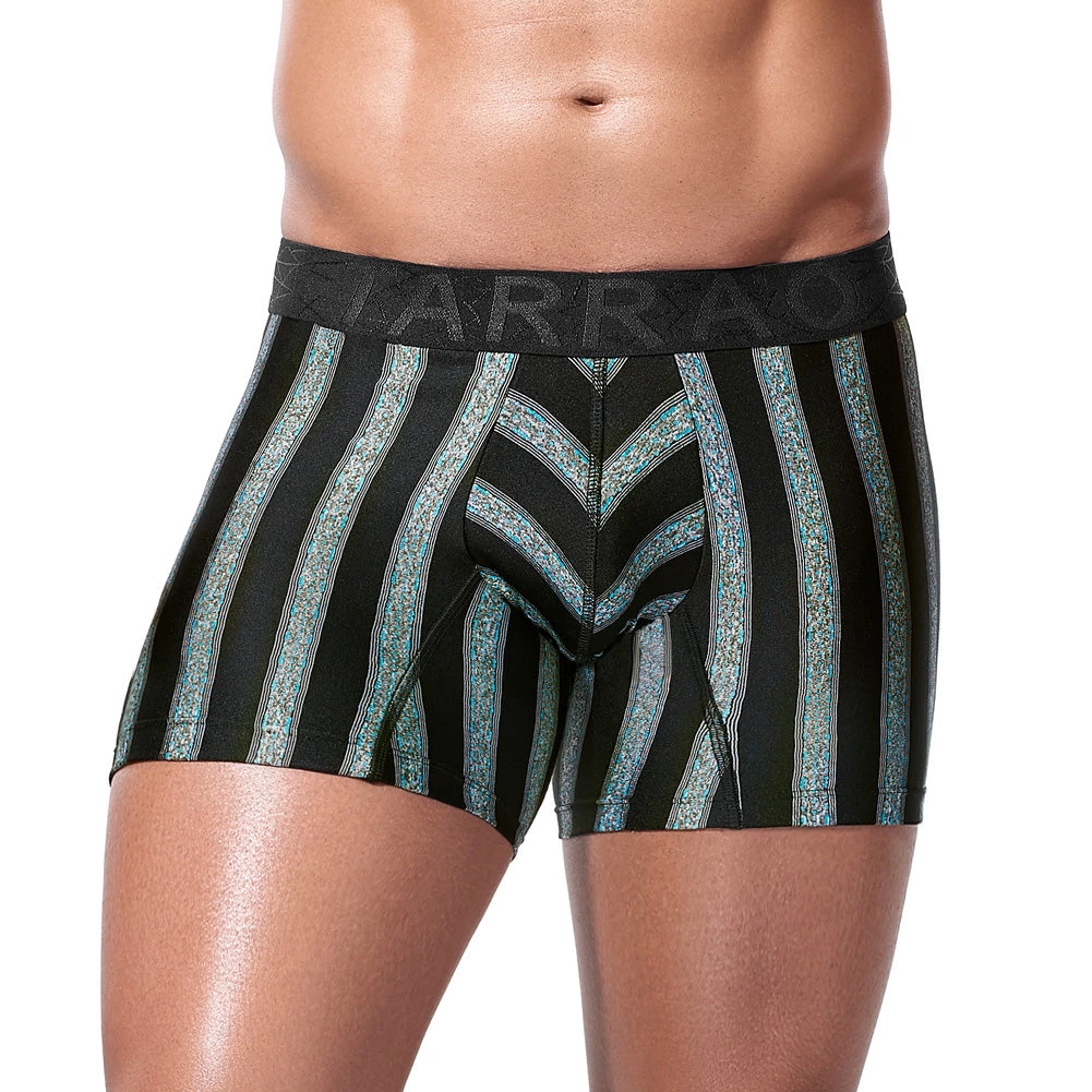 Microfibre boxer short in a wide band black and speckled grey vertical stripe with a black elastic waist band stitched with the Tarrao brand name in black. Material Composition: 93% Polyamide, 7% Spandex.
