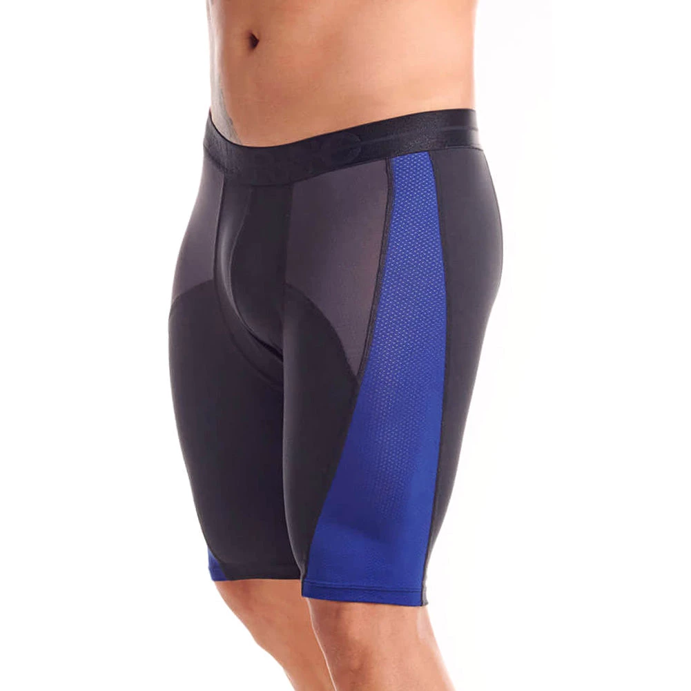 Tarrao xtra long leg sports boxer made from partially perforated transparent mesh fabrics in black and blue, with a black elastic waist band stitched with the Tarrao brand name in black. Material Composition: 87% Polyester, 13% Elastane.