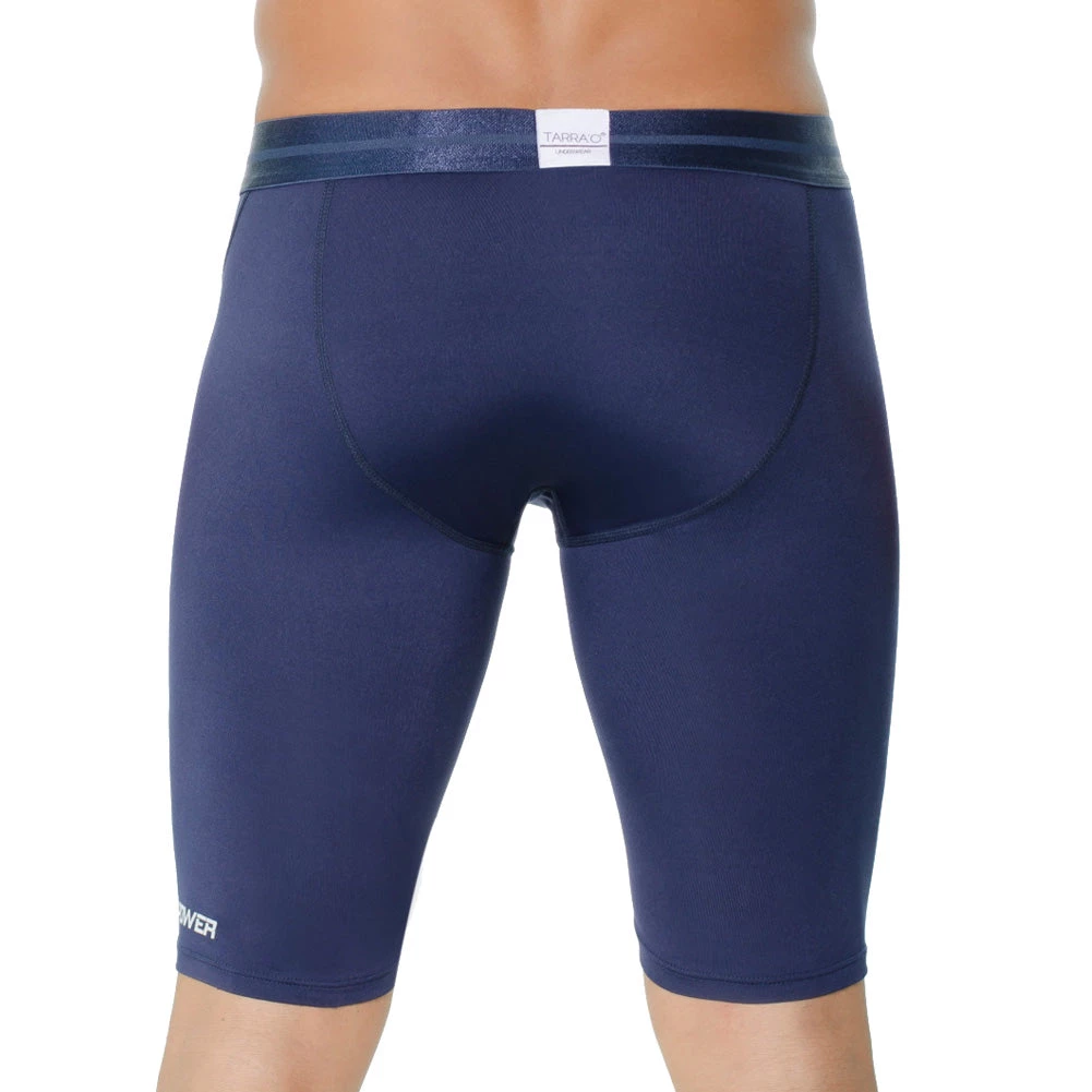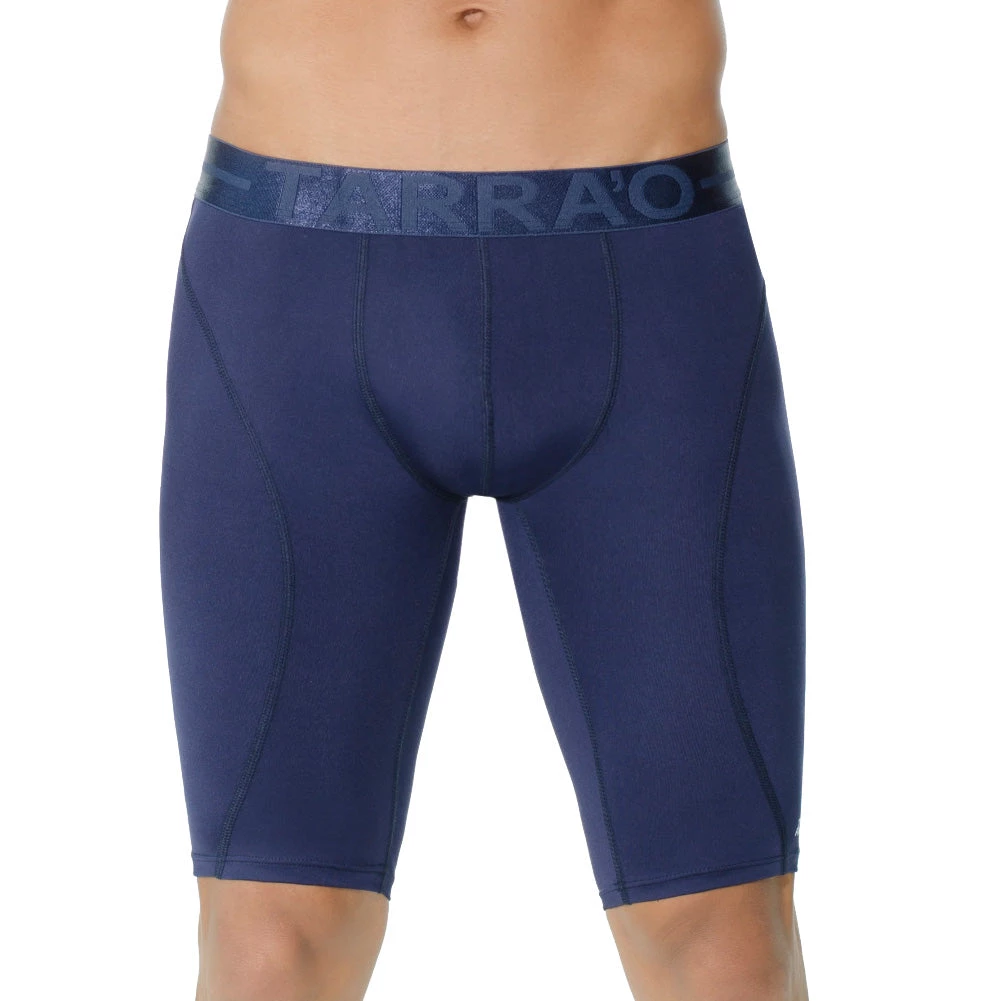 Sports styled xtra long leg microfibre boxer deep blue in colour, with a deep blue elastic waist band stitched with the Tarrao brand name in dark blue. Material Composition: 87% Polyester, 13% Spandex.