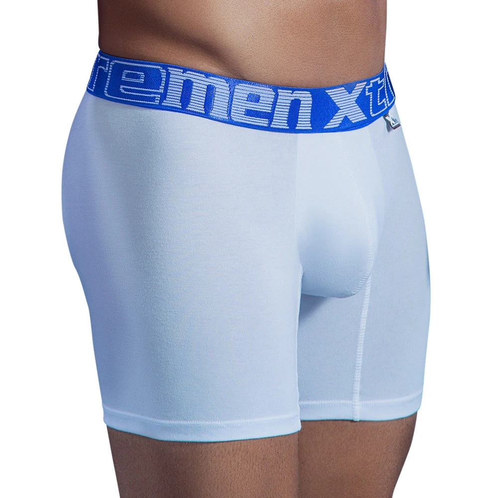 A cotton long boxer in white with a vivid royal blue elastic waistband stitched with the Xtremen brand name in white. Material Composition: 90% Cotton, 10% Spandex.