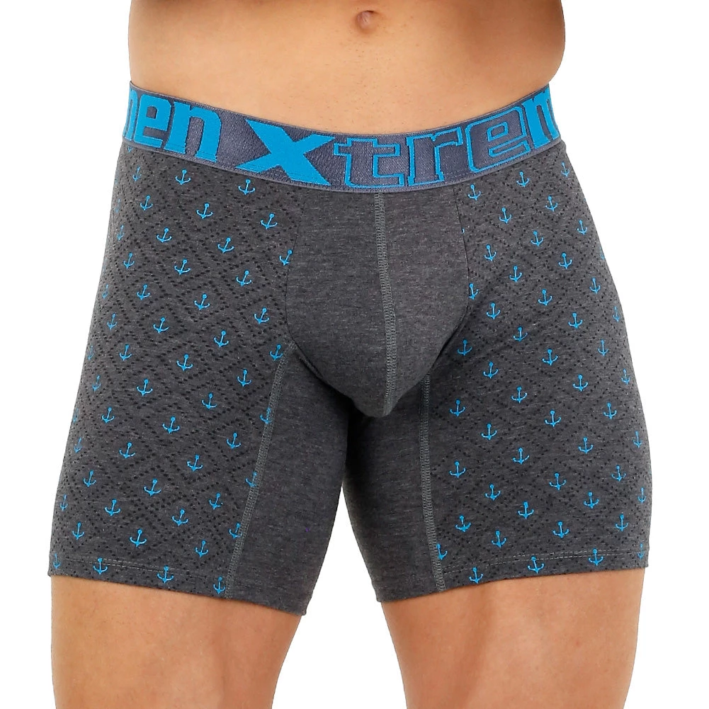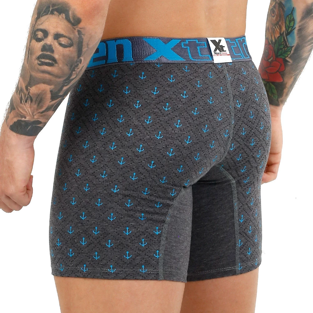 Mottled grey fabric long boxer with a light blue geometric anchor pattern and a grey elastic waist band stitched with the Xtremen brand name in light blue. Material Composition: 65% Polyester, 25% Cotton, 10% Elastane.