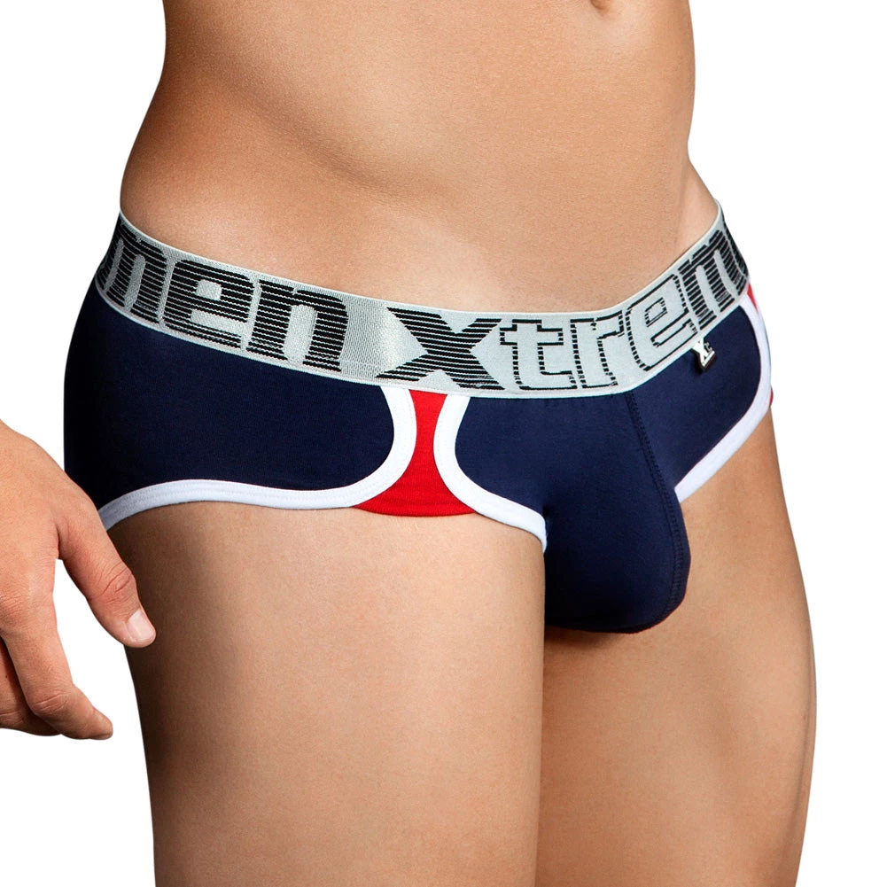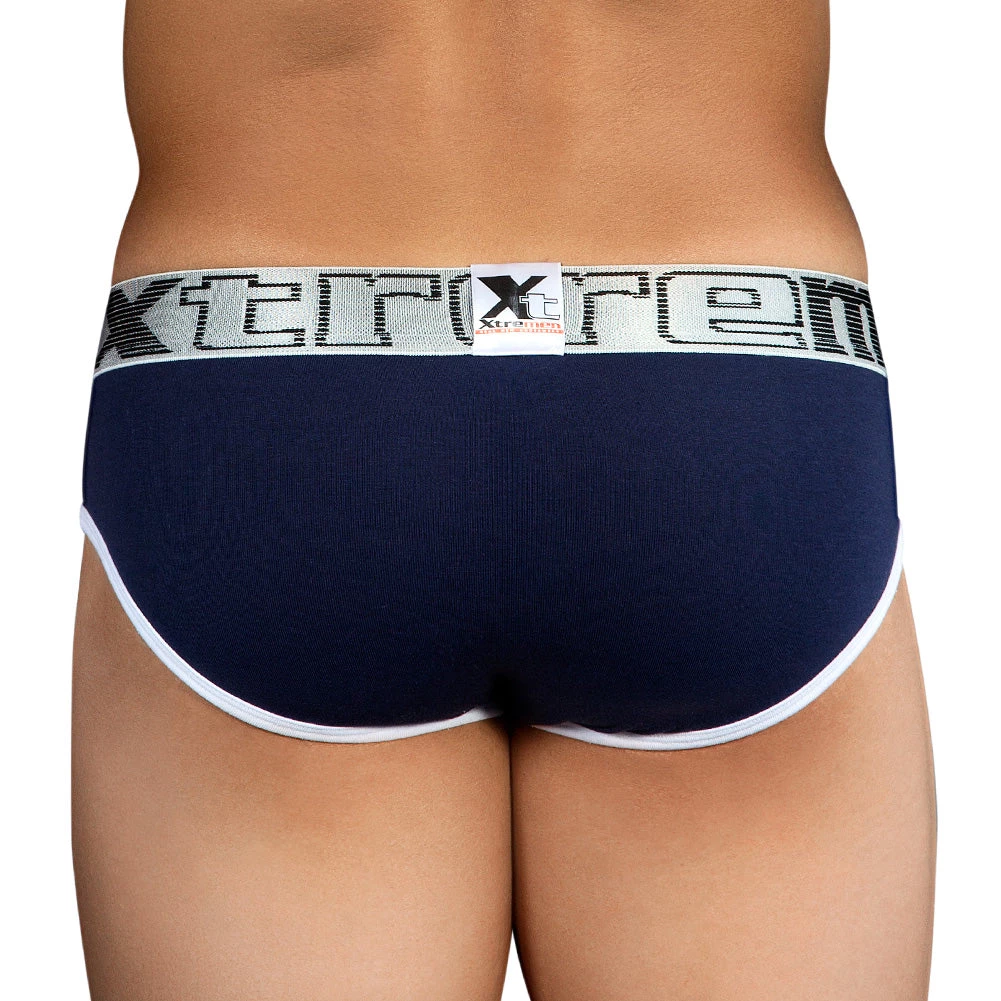 Dark blue brief with white piping trim finish, with a silver-grey elastic waist band stitched with the Xtremen brand name in dark grey. Material Composition: 95% Cotton, 5% Elastane.